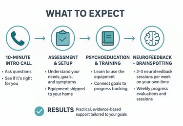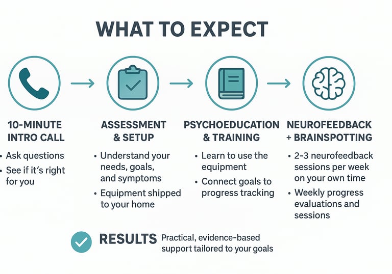 We want to make sure remote Neurofeedback is right for you. The assessment process is to determine the most effective protocols to meet both symptom management and growth goals. Secondly we slow down and do another session while your equipment is on the way to fully understand everything. After this you do neurofeedback sessions on your own time and meet once weekly for coaching, therapy, and evaluation of protocols for a minimum of ten weeks.